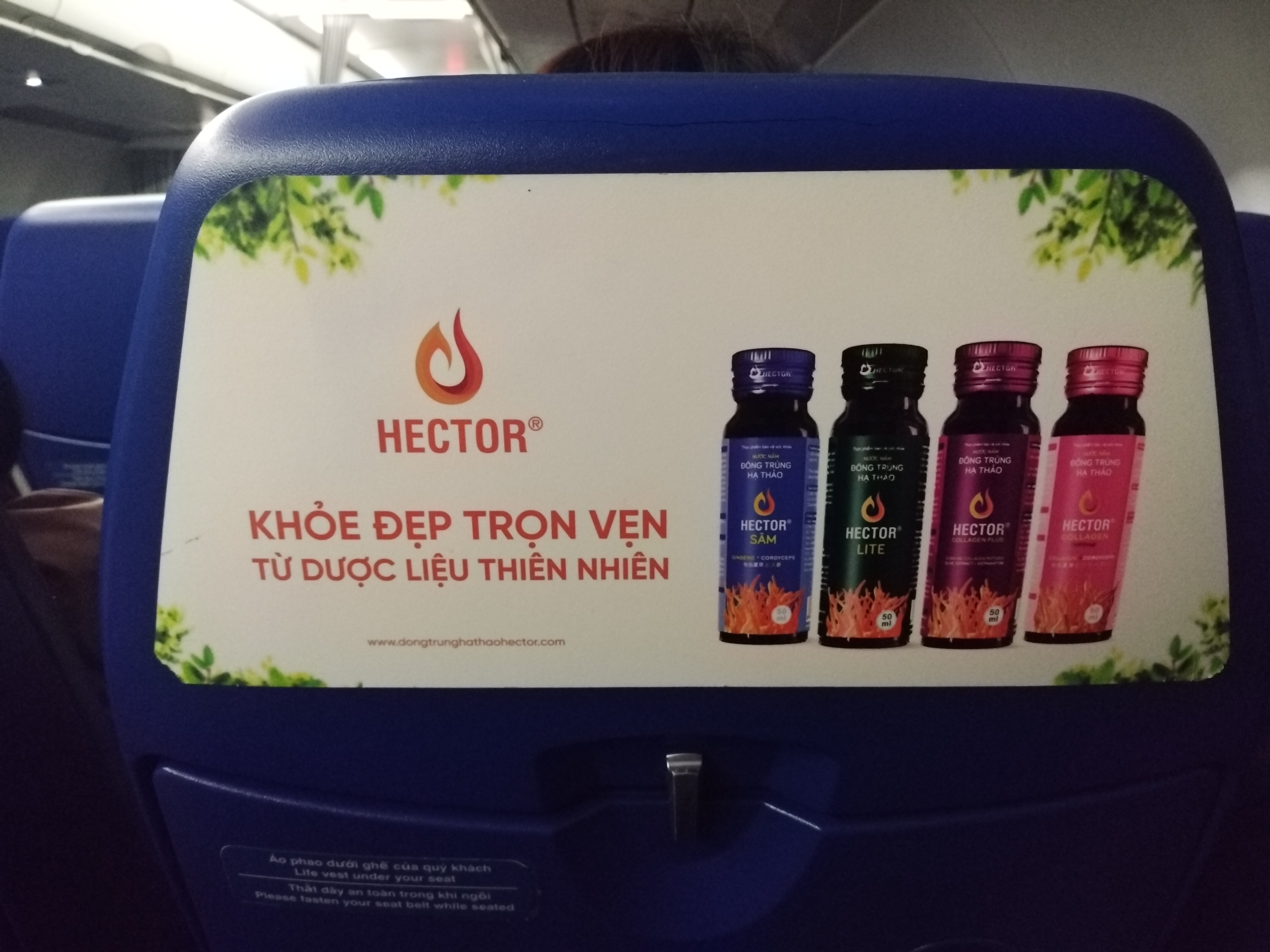 經濟艙兩側的中間位各都有這種廣告,似乎是提神飲料,但在越南的超市似乎沒看到(其實也沒認真找)。