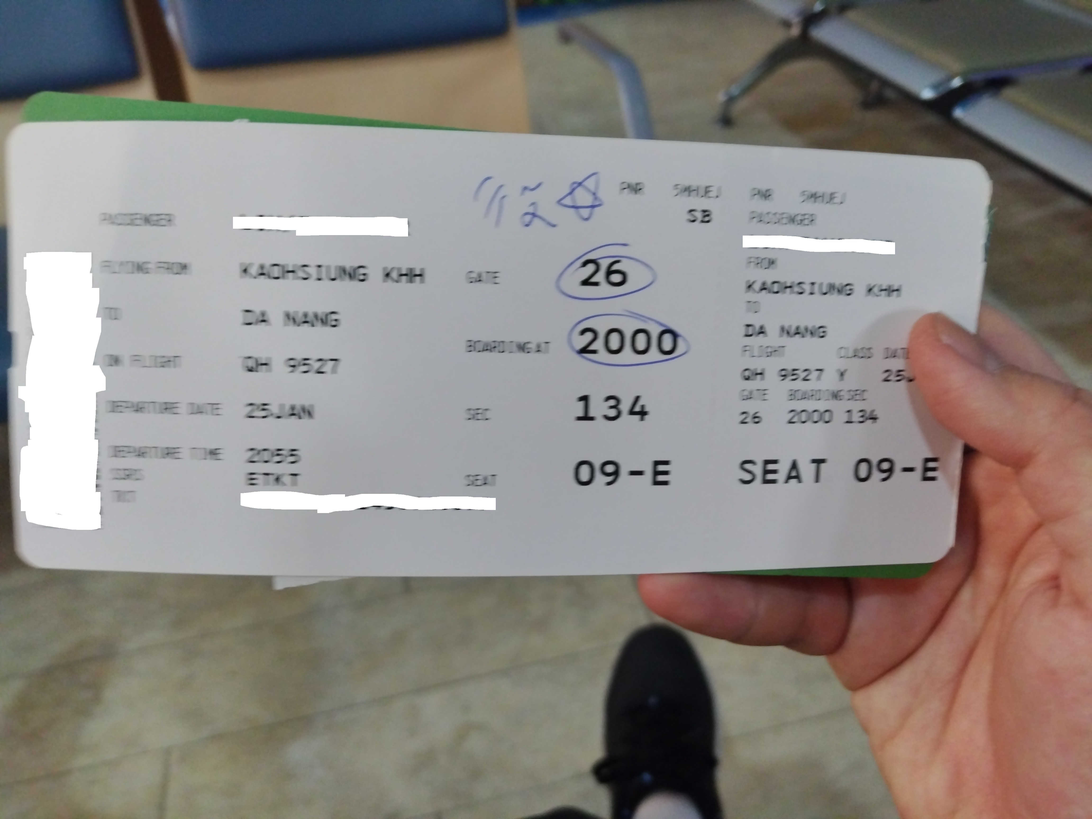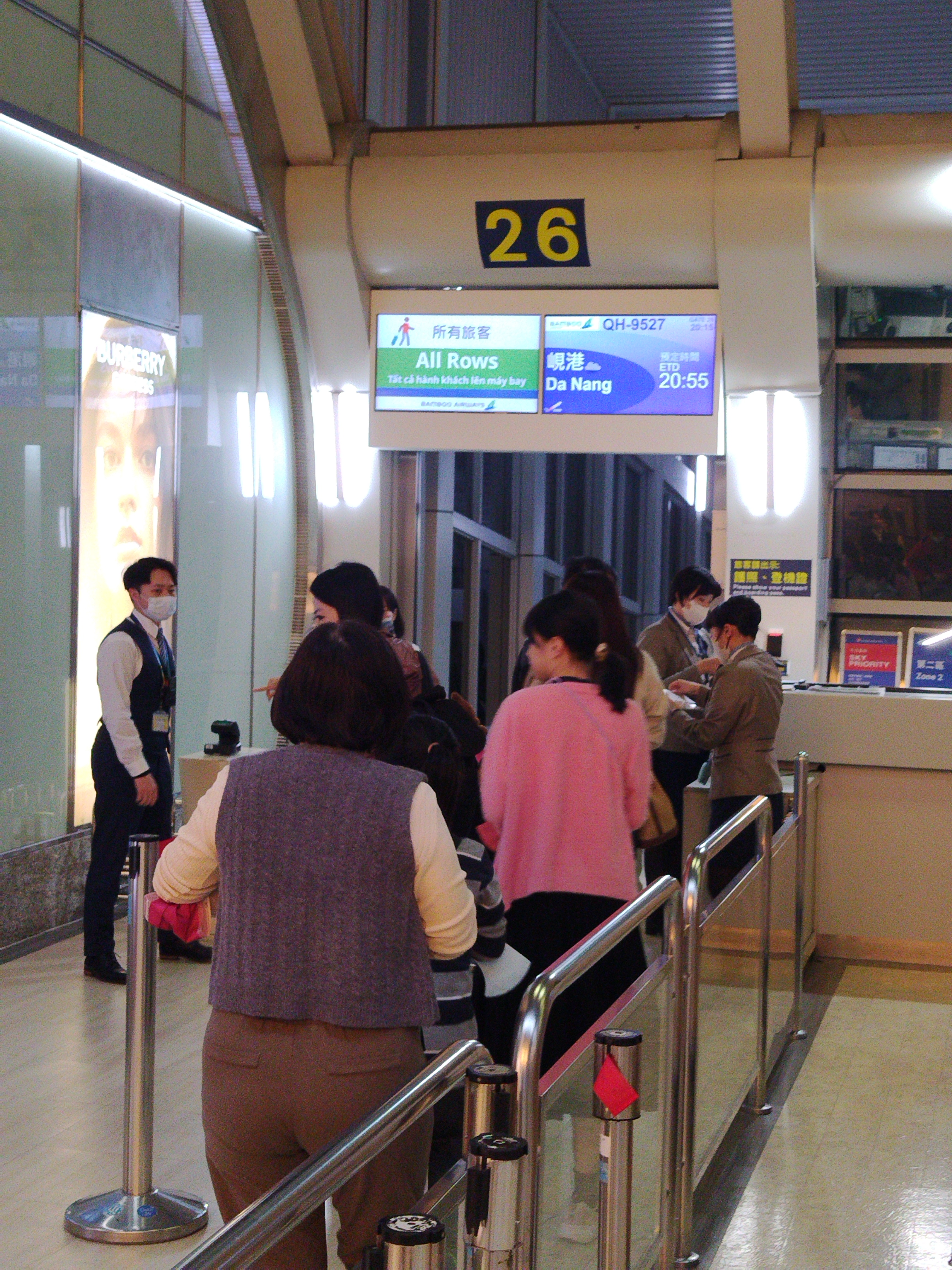 越竹航空的報到櫃檯是出境大廳最左側區域,地勤工作由台灣天際代理。越文告示顯然是引用越竹航空自己的版本,但我懷疑本班機乘客有多少人看得懂?畢竟旅行社包機基本上都是我國籍團客。另外報到似乎也僅掛行李發登機証的流程,位置應該都劃好的沒有選位。
