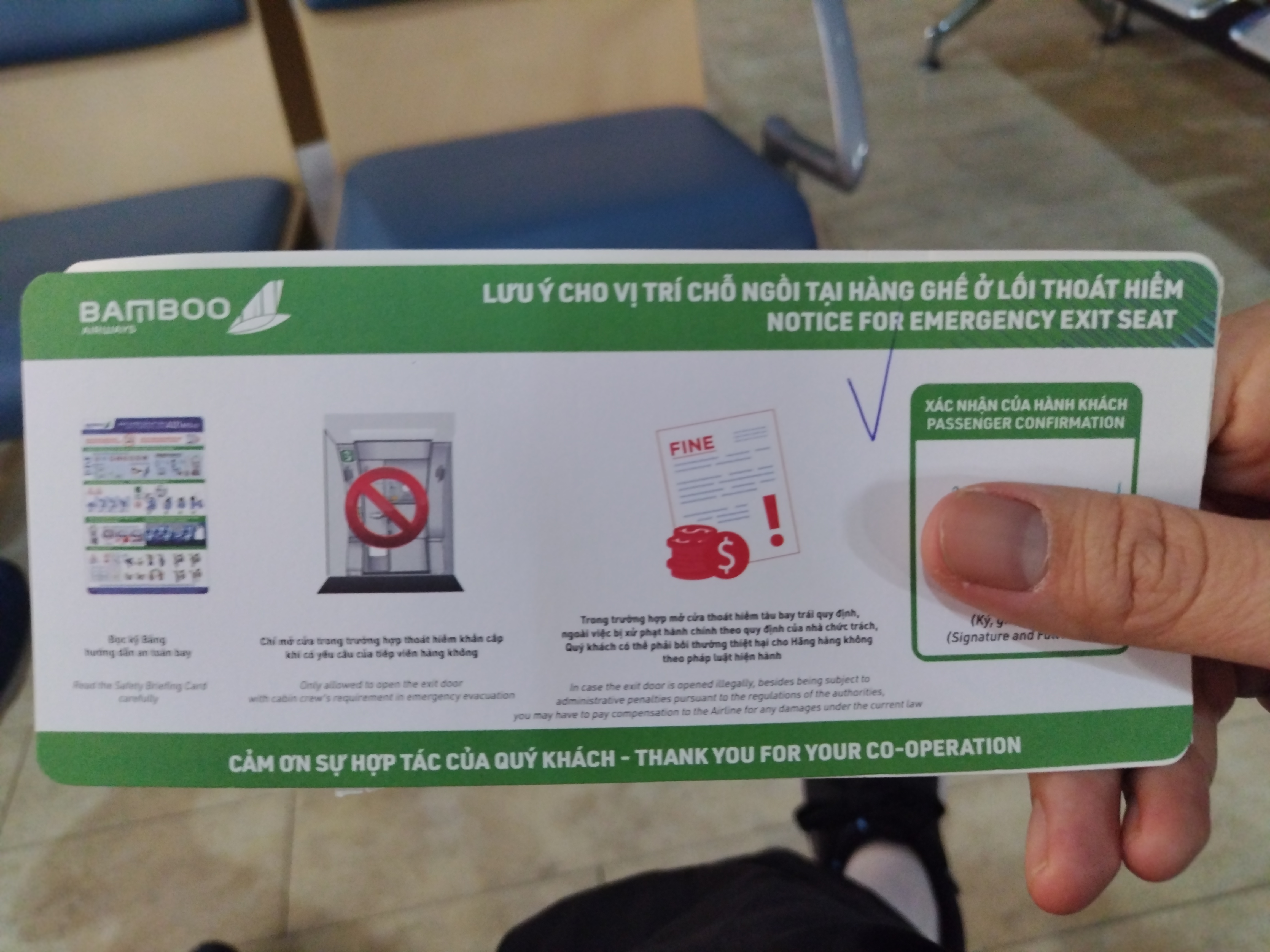 另外地勤表示這次分到逃生門位,所以請看過這張小卡並簽名(手指遮蔽處)。一聽大喜,仔細地看過後就簽名了。可實際呢……