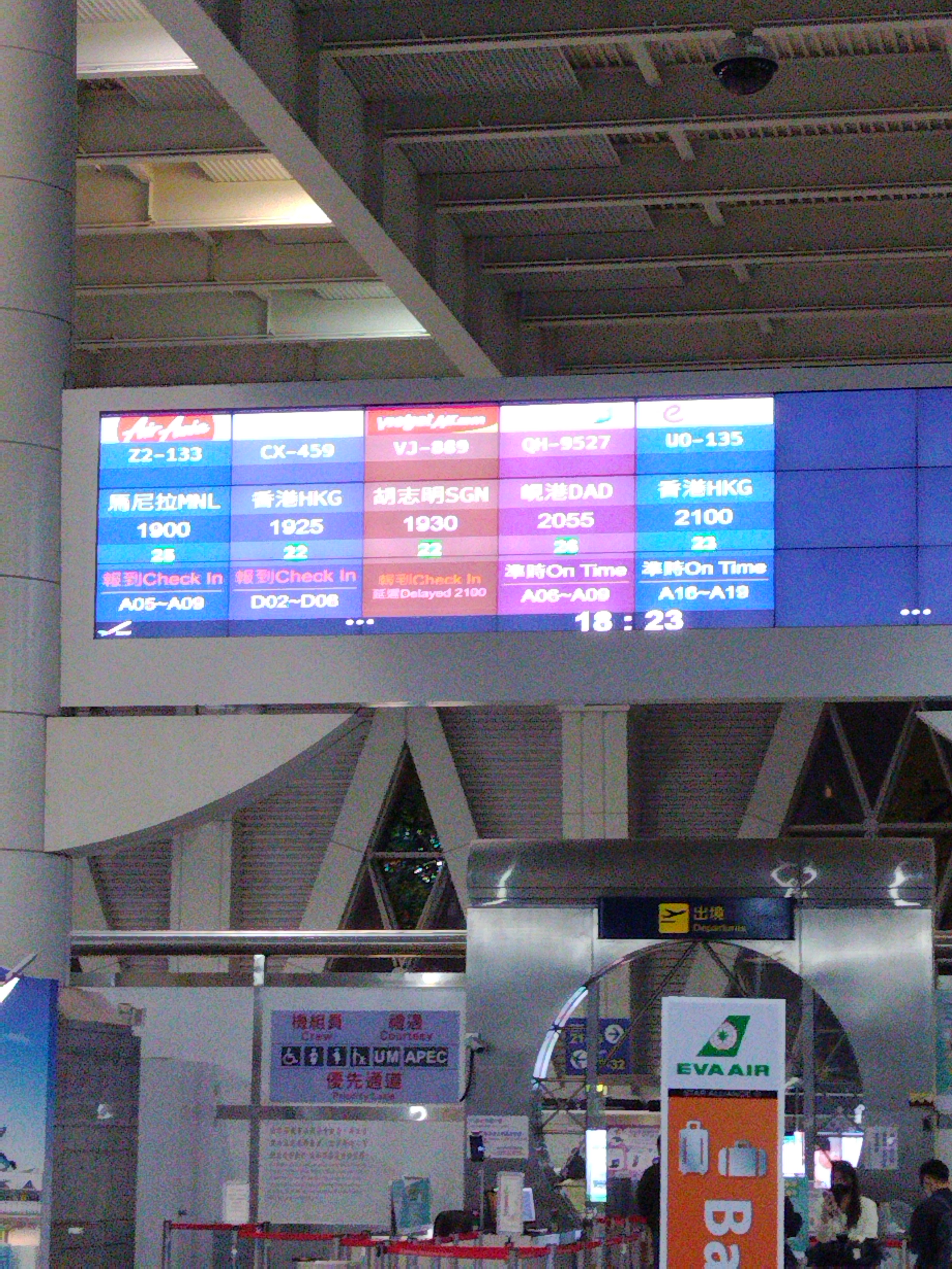 出境大廳曾受到討論的航班資訊表,當天UO-135有執飛故本次要搭乘的QH9527退居為表定第二晚離場的航班。不過這是「表定」,遲到大王越捷航空往胡志明市的VJ889當時就已掛出延遲,而後更成為當日實際最晚離場的航班。